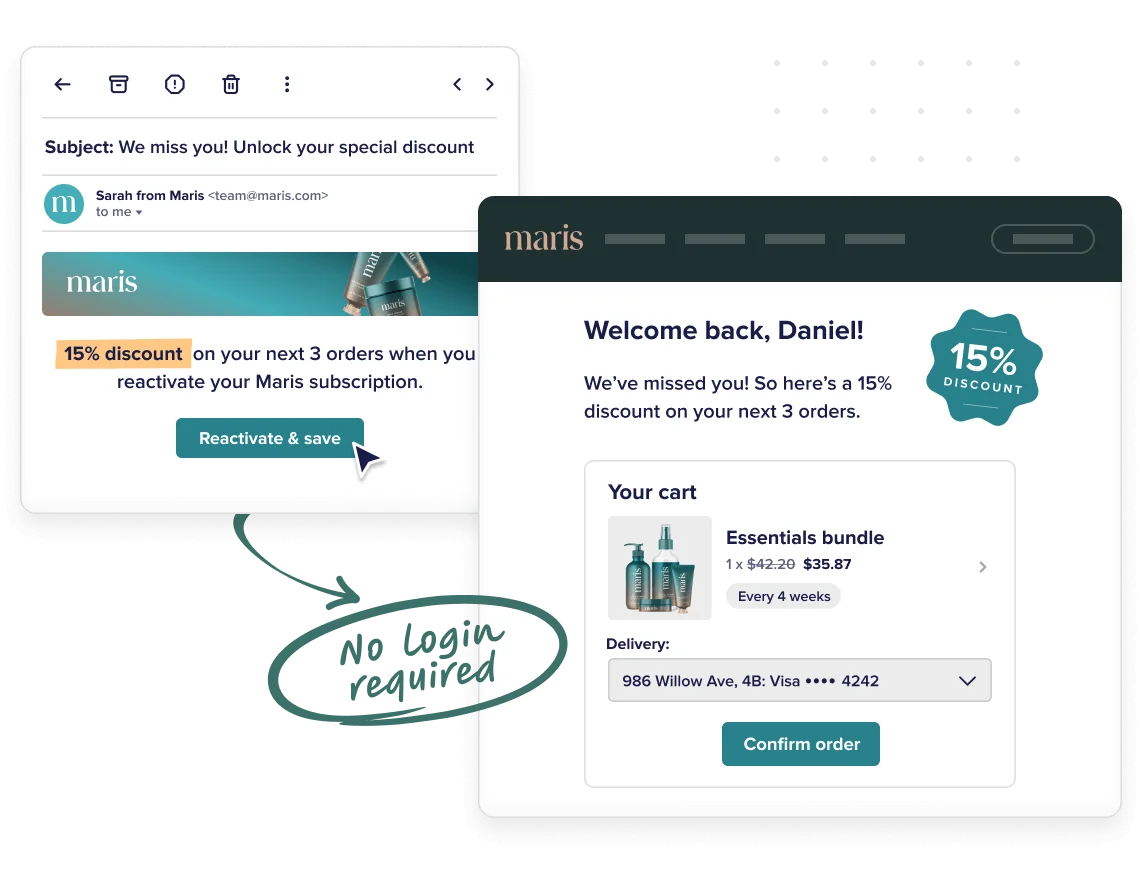 Win Backs lets customers resubscribe without even logging in, and it processes charges immediately—no delays, no fussing with billing cycles, just clicking and ordering.