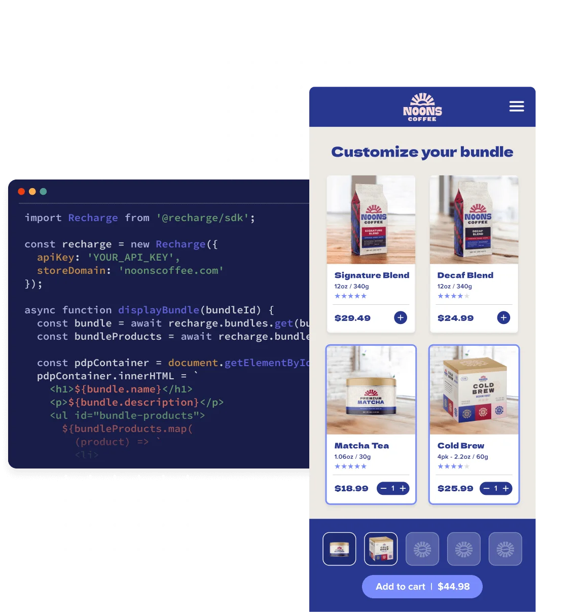 Let shoppers build custom bundles for a personal touch, or curate preset bundles yourself. Both customizable and preset bundles support both recurring and one-time purchases, along with subscription discounts.