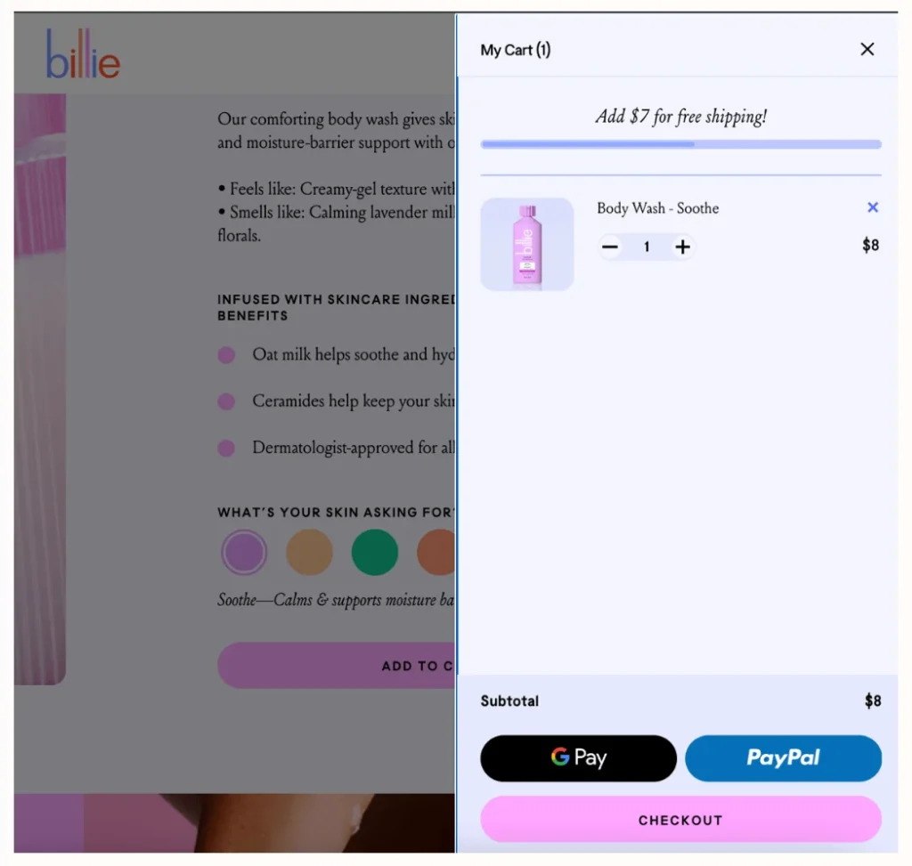 Billie offers free shipping on all orders over $15, making for a smart strategy to increase AOV.