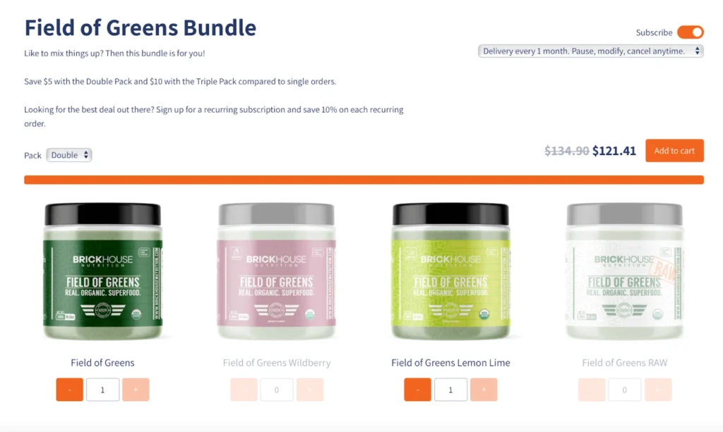 Giving consumers the option to bundle their products can help you boost your company’s GMV by increasing the number of goods sold. Typically, bundles come with a discount, which will make your customers happy and help you get rid of more inventory. Bundling can also increase your AOV—merchants like BRICKHOUSE nutrition have boosted AOV by 75% using bundles.