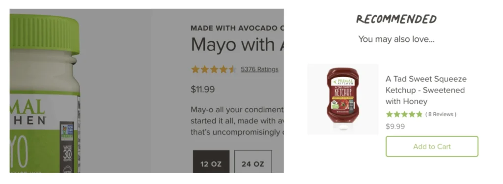 Primal Kitchen offers cross-sell options when you add a product to the cart, such as recommending ketchup when you purchase mayo.
