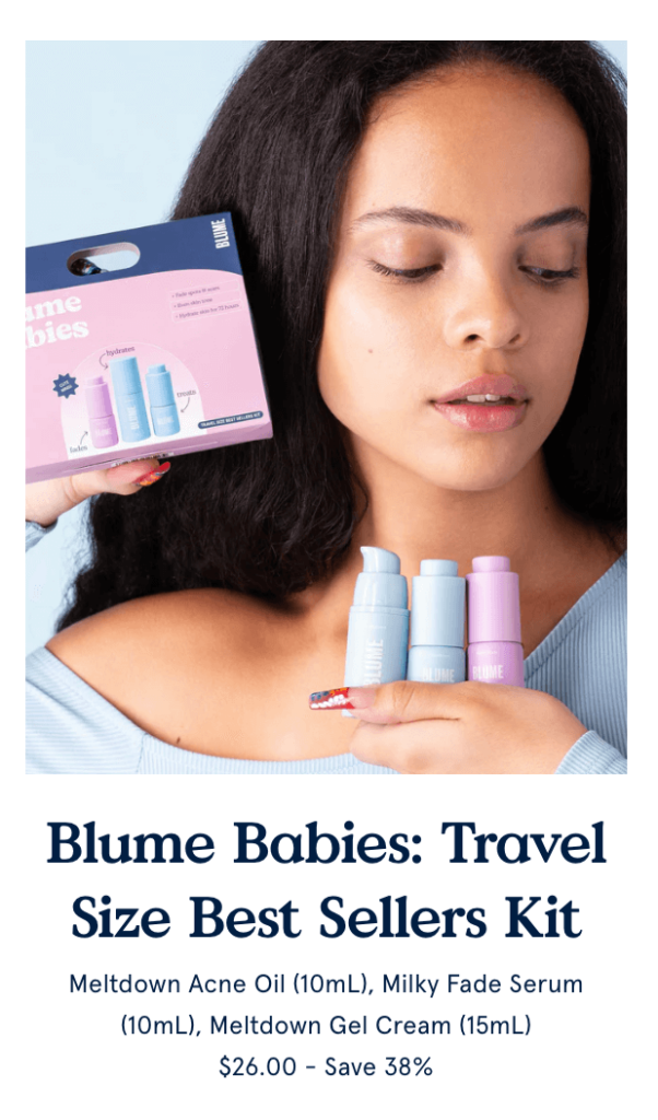One great product bundling example for this type of pure bundle comes from Blume. Their Blume Babies are travel-sized bottles of their most popular skincare products. But, none of them are sold separately in the smaller size. So, Blume has created a combined package that motivates customers to buy three products (instead of just one potentially) and has the opportunity even to introduce customers to new products.