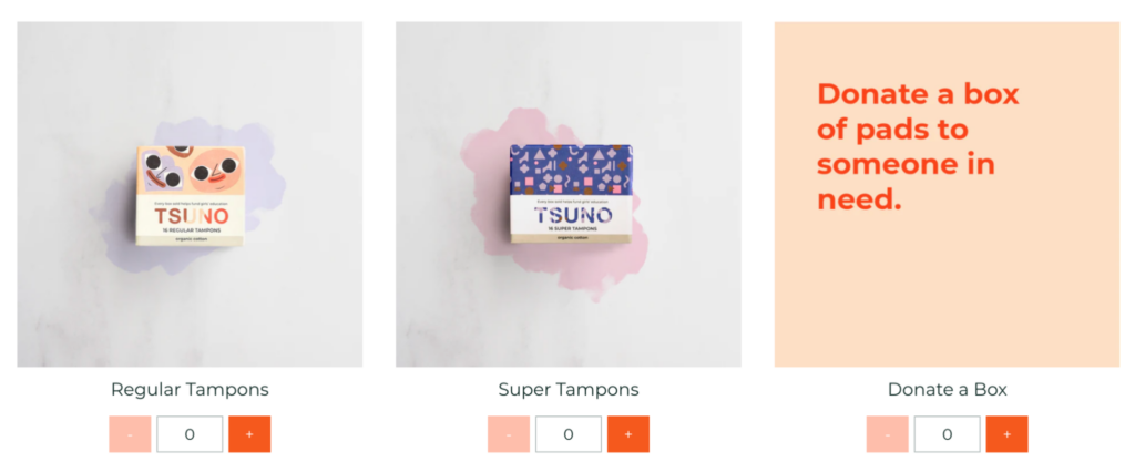 Tsuno is a brand that goes beyond their products—they donate 50% of their profits to help fund girls’ education. So, it only makes sense that their mixed product bundle also includes a donation element. As customers create product bundles, they have the opportunity to donate a box of pads to someone in need.