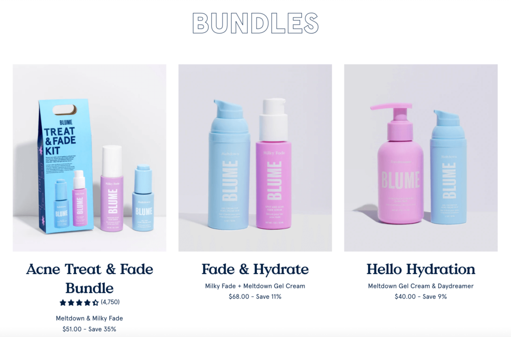 Blume, a skin, body, and period care company, has their skincare bundles focused on specific problems customers might be having—making it super easy for them to shop and buy bundles to treat an issue.