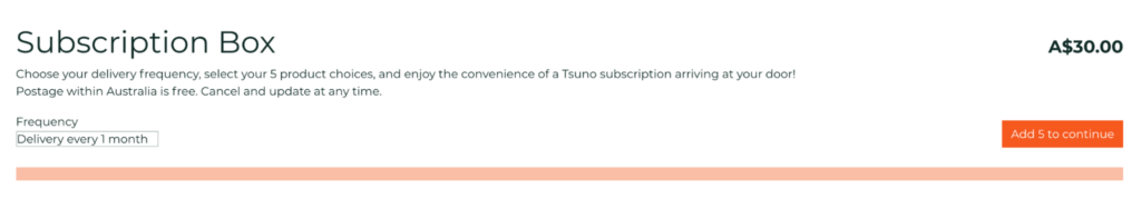 Tsuno is a great example of build-a-box bundling. They offer customizable bundle boxes of period care products, including tea and chocolate. Their website guides customers through building a custom box—all they have to do is select five items from the page, plus the frequency they’d like the shipment. If they want to swap out items in their next order, it’s easy to do.