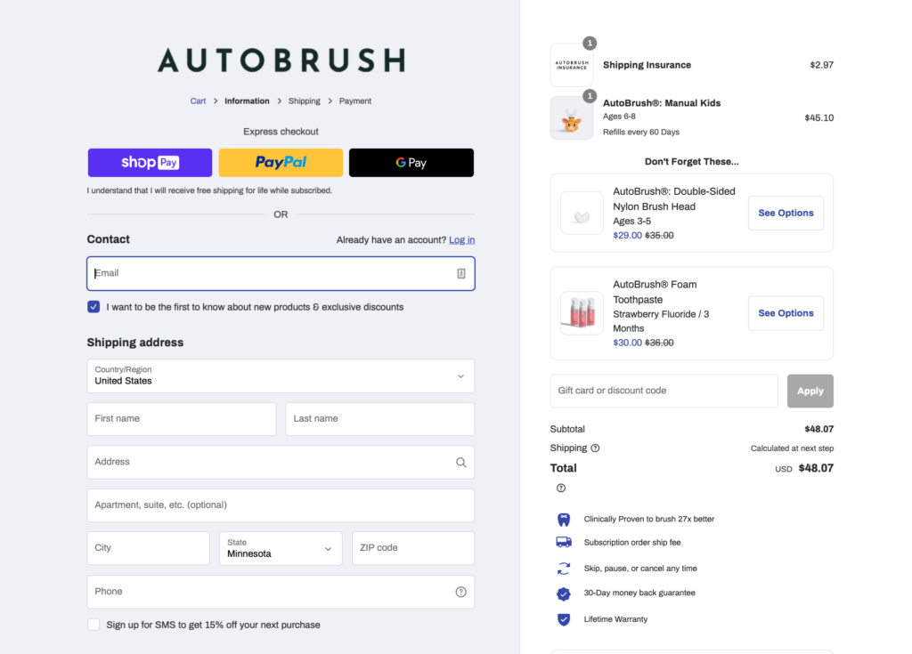 AutoBrush’s U-shaped electric toothbrushes and other dental hygiene products are dentist-approved and designed to make oral care simple and effective. They not only accomplish this through their products themselves, but also through their nurturing purchase journey, including their checkout process.