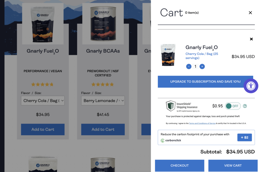 Ensuring a simple and intuitive online shopping experience is crucial for Gnarly Nutrition, whose customers purchase items both as one-time products and via subscriptions as part of a regular routine. Their checkout supports this goal, with easy buttons to upgrade from a one-time purchase to a subscription for a discount. This makes it convenient for customers who are interested in a recurring purchase option to find it before completing the purchase.