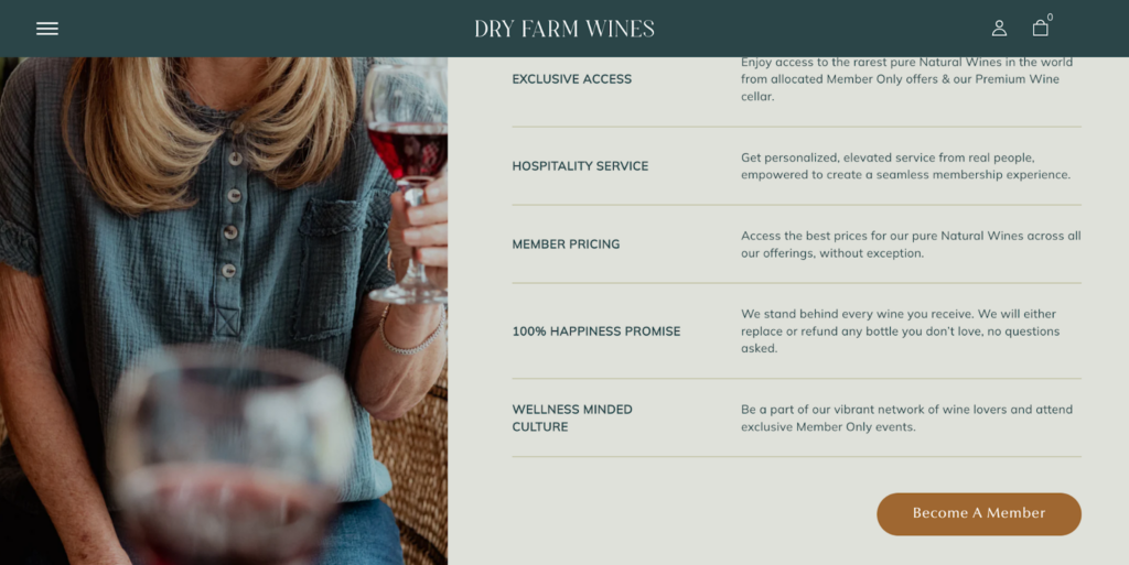Dry Farm Wines is an example of a merchant who does both. They arrange exclusive member-only events for those that are part of their membership program, and their participants can also benefit from special member pricing and exclusive access to their products.