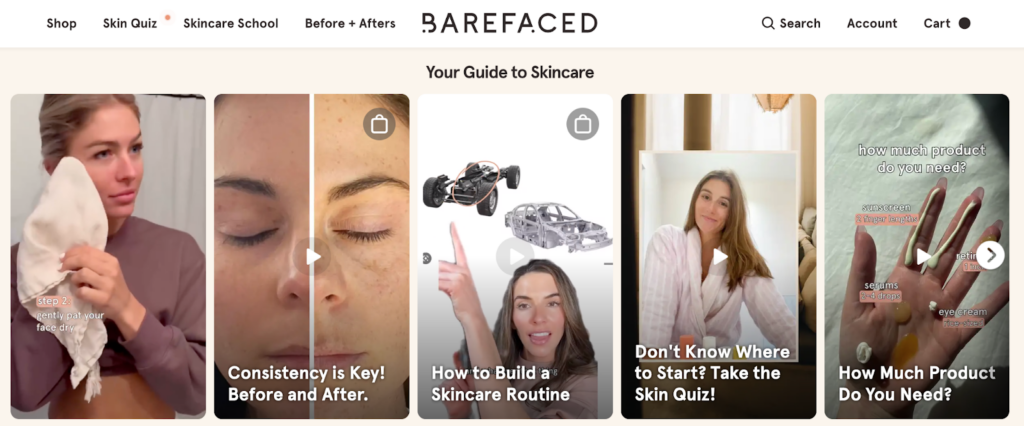 Barefaced is a skincare brand that exemplifies this. Through their social media channels, they combine user-generated content with educational content as part of their marketing strategy, generating value beyond selling products. As mentioned previously, verticals like wellness and skincare need to build credibility through channels like word of mouth or relevant, engaging content to boost brand loyalty and reputability.