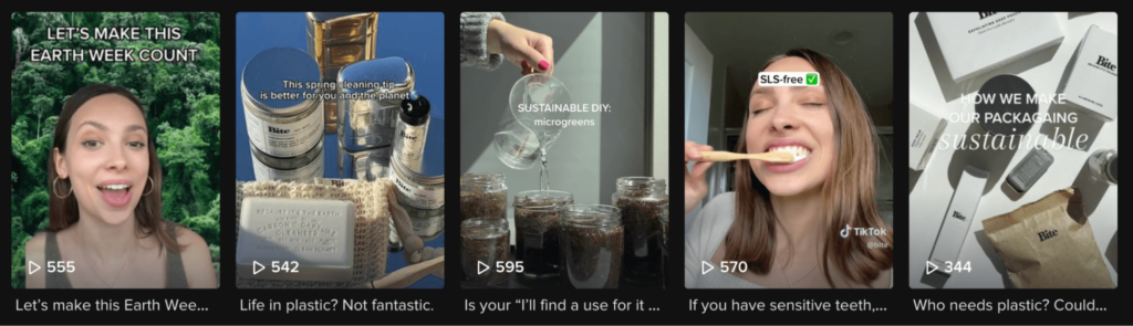 Bite creates community by sharing the things that matter to them as a brand—with sustainability at the forefront. In this way, they create a community around their mission and not just their products. They also post consistently on TikTok with helpful and informative videos that make them easy to find when searching on the app.