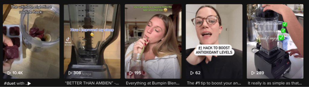 While TikTok really lends itself to Beauty & Personal Care and Health & Wellness verticals, it’s also a great place for those in the Food & Beverage vertical, too. Take Bumpin Blends, for example. Their TikTok is an extension of their brand and the perfect place to showcase customer reviews in the form of videos—leading to better trust among new customers and excitement to try their products.