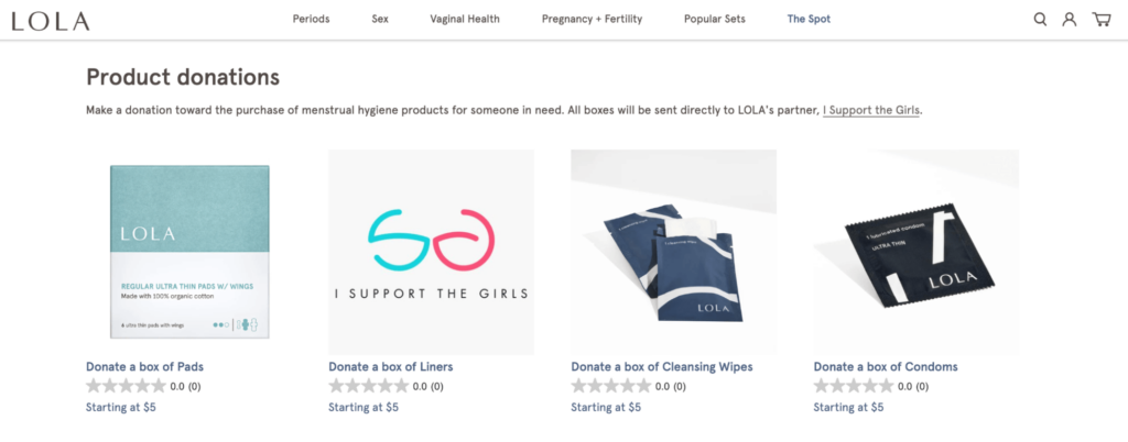 LOLA, a feminine care brand, has a donation program that aims to provide menstrual products to people who may not have access to them. The program is called “LOLA Gives Back,” and it works by donating a portion of every LOLA purchase to organizations that help distribute menstrual products to those in need. Through this program, LOLA partners with organizations like I Support the Girls to combine the convenience of their product offerings with their mission to provide high-quality menstrual products and address the issue of menstrual inequality.