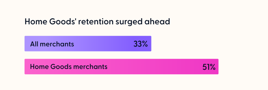 In 2022, these subscribers held an average of 45% retention after 6 months, and 33% retention after 12 months. Some verticals, such as Home Goods, vastly surpassed the merchant average.