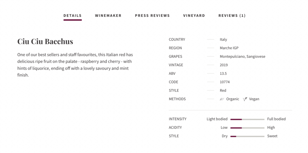 While keeping your audience’s familiarity with wine in mind, be sure to have some description on each PDP that describes the wine’s flavors. Depending on your customer base, you may be able to get creative with these descriptions, which presents a great opportunity to infuse your brand voice into the page.