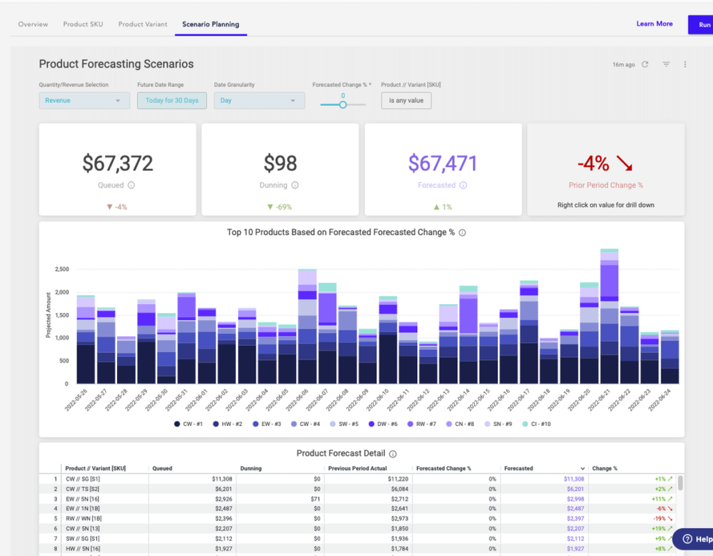 All Recharge Pro and Enterprise-level merchants now have access to the updated Scenario Planning dashboard. This dashboard shows future projected data and allows merchants to create projection scenarios for both revenue and physical products to be sold. We’ve added new filters, additional metrics, and drilldown options that provide greater insight into processed or unrealized orders.