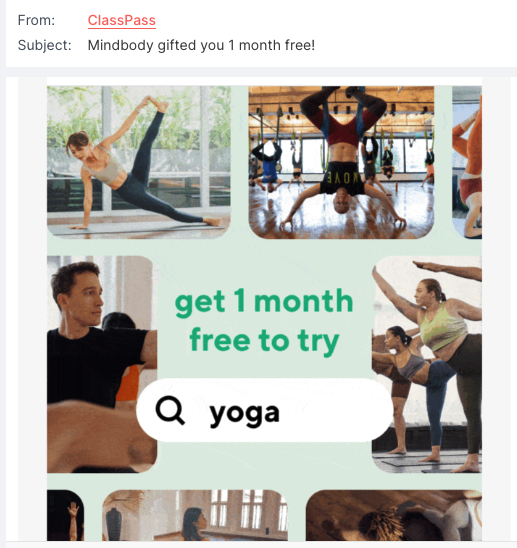 An example of this: ClassPass, which offers fitness classes, sent an email encouraging a customer to join their membership services with 1 month of free classes with the CTA “get 1 month free to try.”