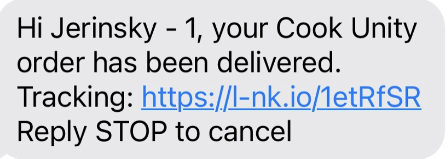 CookUnity, which offers food subscription boxes, sent this SMS message to a customer letting them know that their order has been delivered with tracking information: