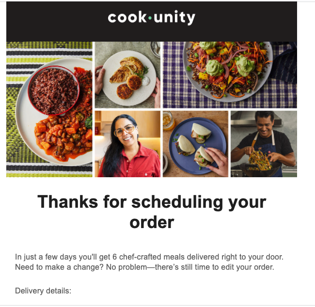 For example, CookUnity sent a customer this email thanking them for their order and informing them that there was still time to make changes to their order: