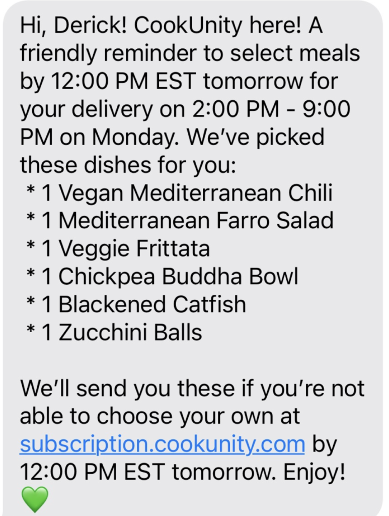 Below, CookUnity shows a great example of a personalized SMS message to a customer. The message begins by greeting the customer with their name, then recommends several meals to the customer to include in their next order that CookUnity believes the customer will enjoy. The brand also uses this email as an opportunity to send a personal reminder to the customer to select their meals before the cutoff time the following day.