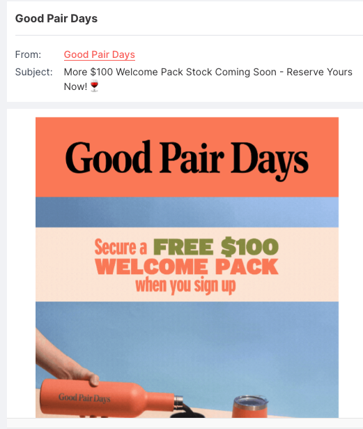 Another example: Good Pair Days, which offers a wine subscription service, incentivized a customer to sign up for a membership with a free $100 welcome pack. Language like “Reserve Yours Now!” in the subject line and a CTA of “Secure a Free $100 Welcome Pack when you sign up” helps motivate the customer to take action and sign up for the membership.