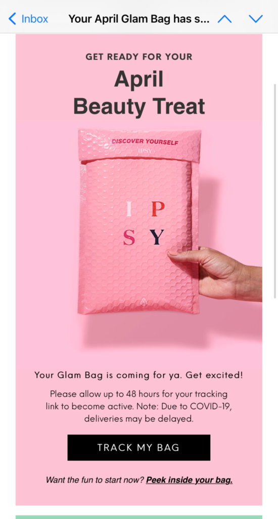 Another example: Ipsy, which offers makeup subscription services, sent a customer the below email to let them know that their April glam bag had shipped and was on its way to them. The email also includes a CTA to enable the customer to track their bag.