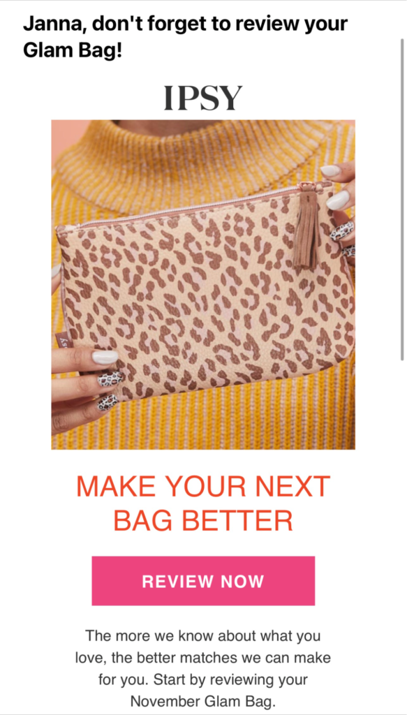 This email from Ipsy demonstrates a great way of asking for feedback from a customer. Ipsy asks the customer to review their Glam bag so that they can be matched with better beauty products in the future: