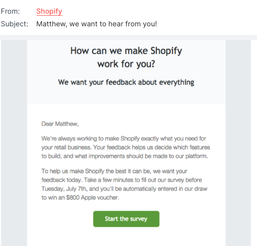Encourage customers to give you feedback with exciting offers, like chances to enter a sweepstakes competition. Below, Shopify shows an example of how to incentivize a customer to take a survey to leave feedback in exchange for the chance to win an $800 voucher: