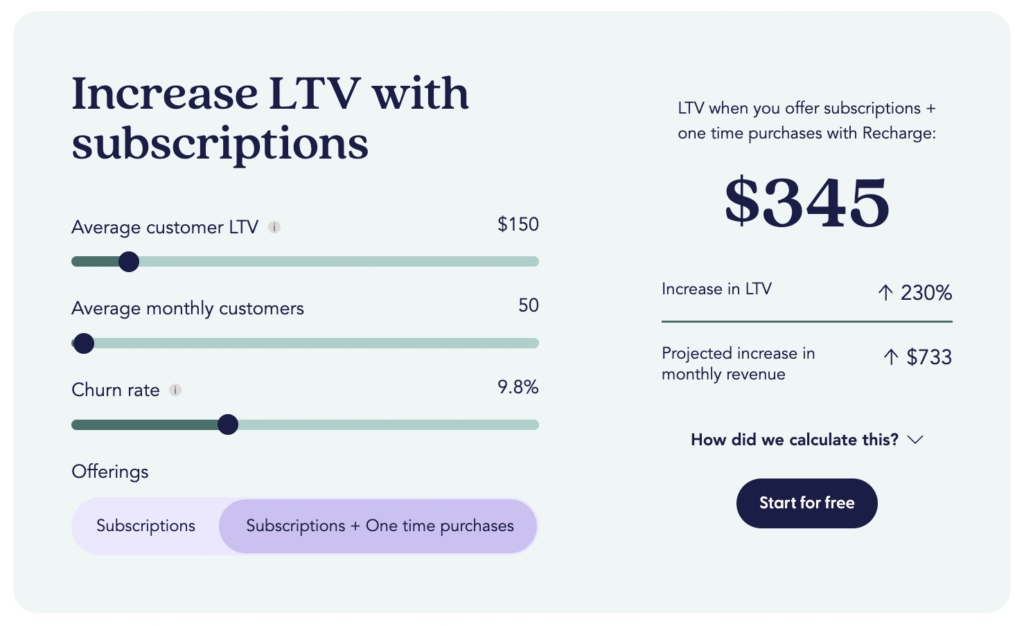 - Recharge’s LTV calculator makes it easy to calculate the amount your brand’s LTV can increase by offering subscriptions.